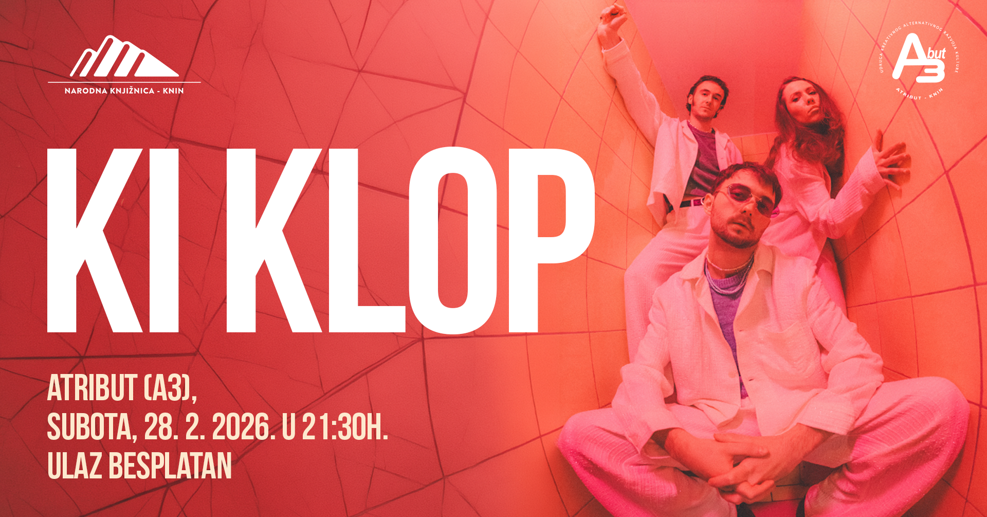 U organizaciji Narodne knjižnice – Knin i udruge Atribut Hrvatski hit bend Ki Klop dolazi u Knin gdje će u subotu 28. veljače u prostoru udruge Atribut (A3) održati koncert.