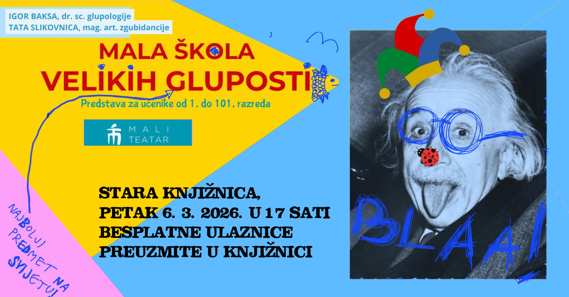Ravnatelj škole: Igor Baksa, doktor glupologije Prvi učenik: Ivan Petranović Švik Uzrast: 5 – 105 Trajanje: 40 minuta Produkcija: Mali teatar, Dramska produkcija Kaleidoskop Besplatne ulaznice preuzmite u knjižnici!