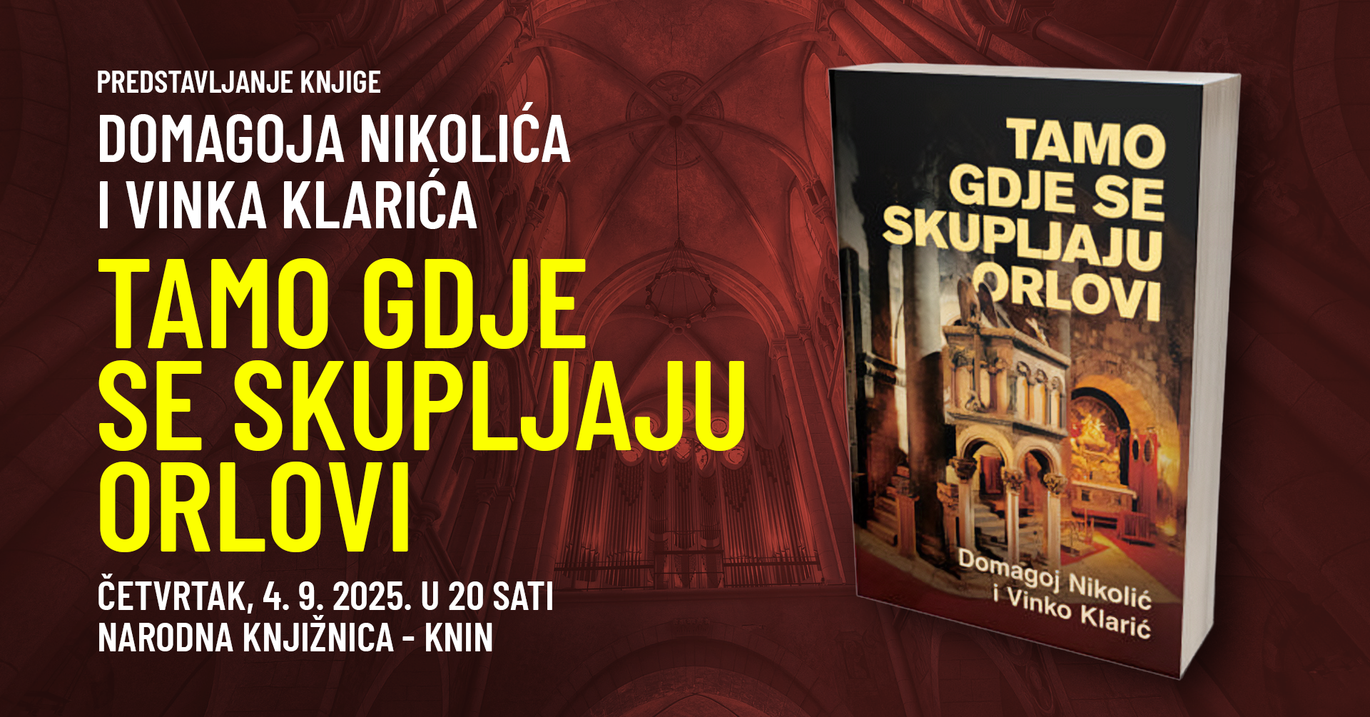 Predstavljanje knjige „Tamo gdje se skupljaju orlovi“ održat će se u Narodnoj knjižnici – Knin u četvrtak 4. 9. s početkom u 20 sati.